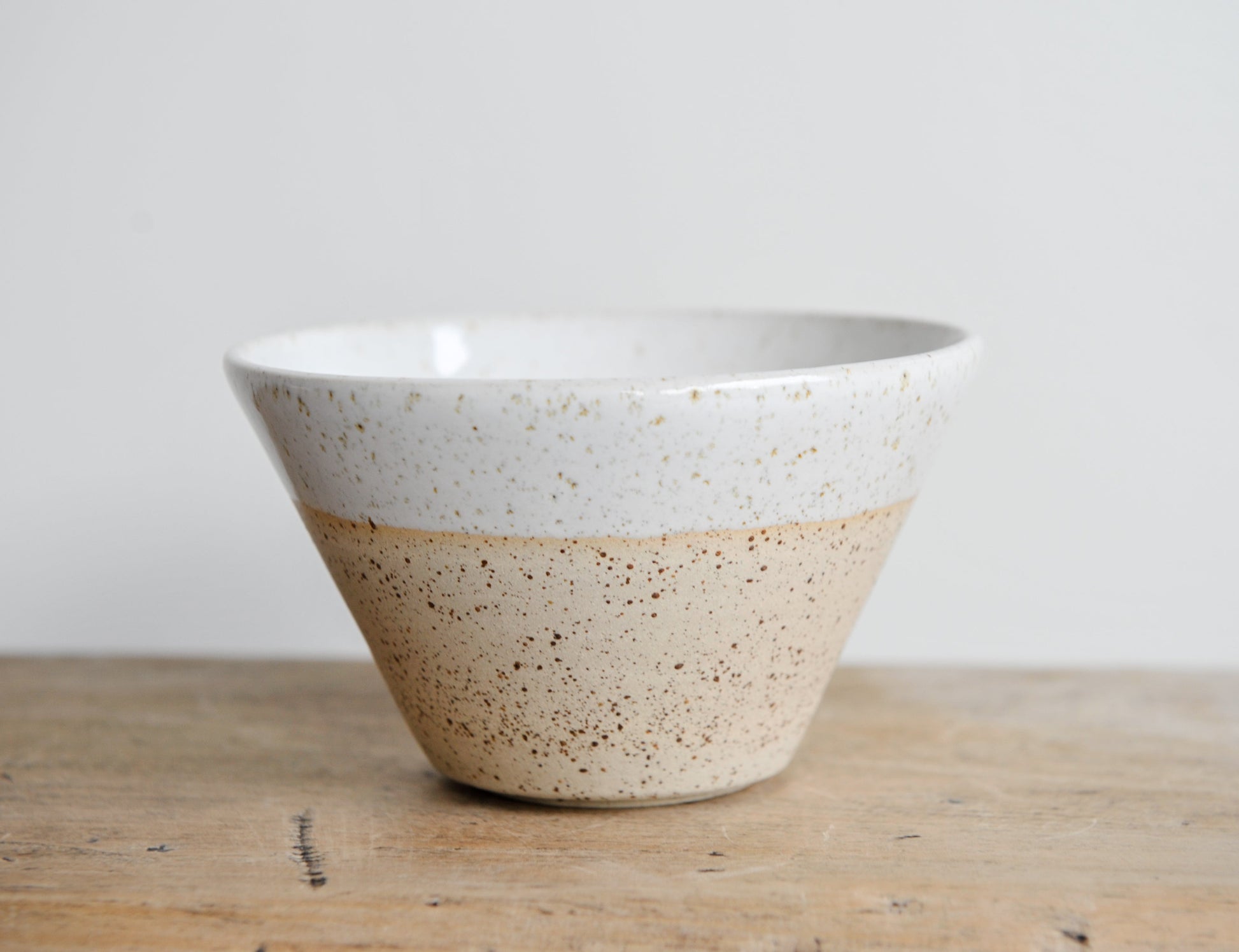 Kommetje met spikkel klei in semi-dekkend glanzend wit glazuur aan de binnenkant en de rand.